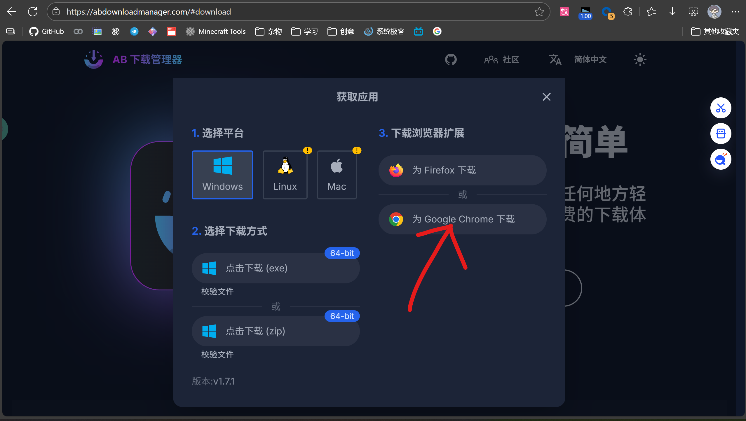 安装软件本身,然后按照途中箭头所指安装浏览器插件 (需要魔法才能访问) 。